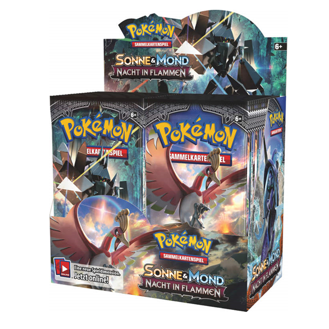 • 36 originale Booster Packs der Sammelkartenspielerweiterung "Sonne & Mond Nacht in Flammen"