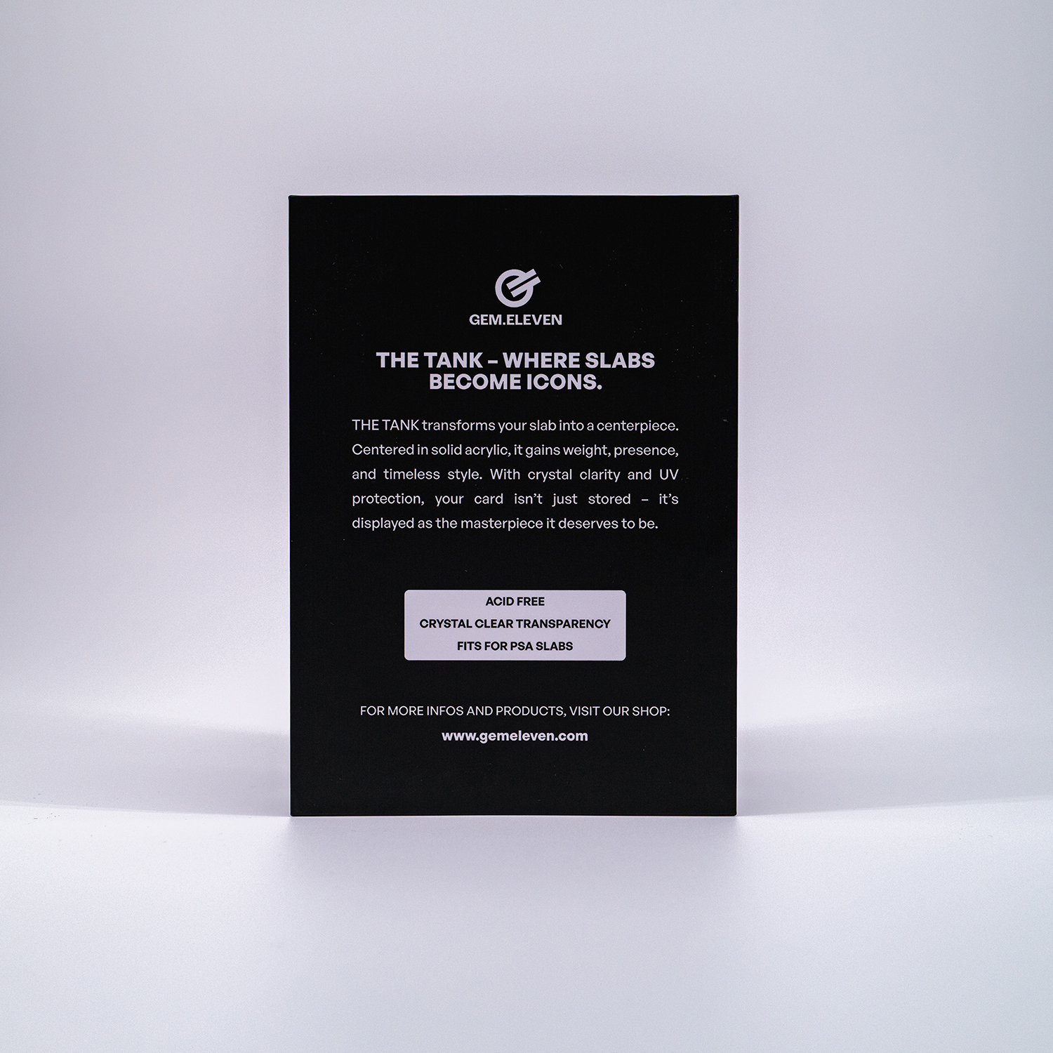 THE TANK ist nicht nur ein Display. Es ist ein Statement. Ein massives Acrylgehäuse, das deinen PSA-, CGC- oder TAG-Slab wie ein Kunstwerk umgibt – geschützt, erhöht und nahezu auf Museumsniveau präsentiert.
